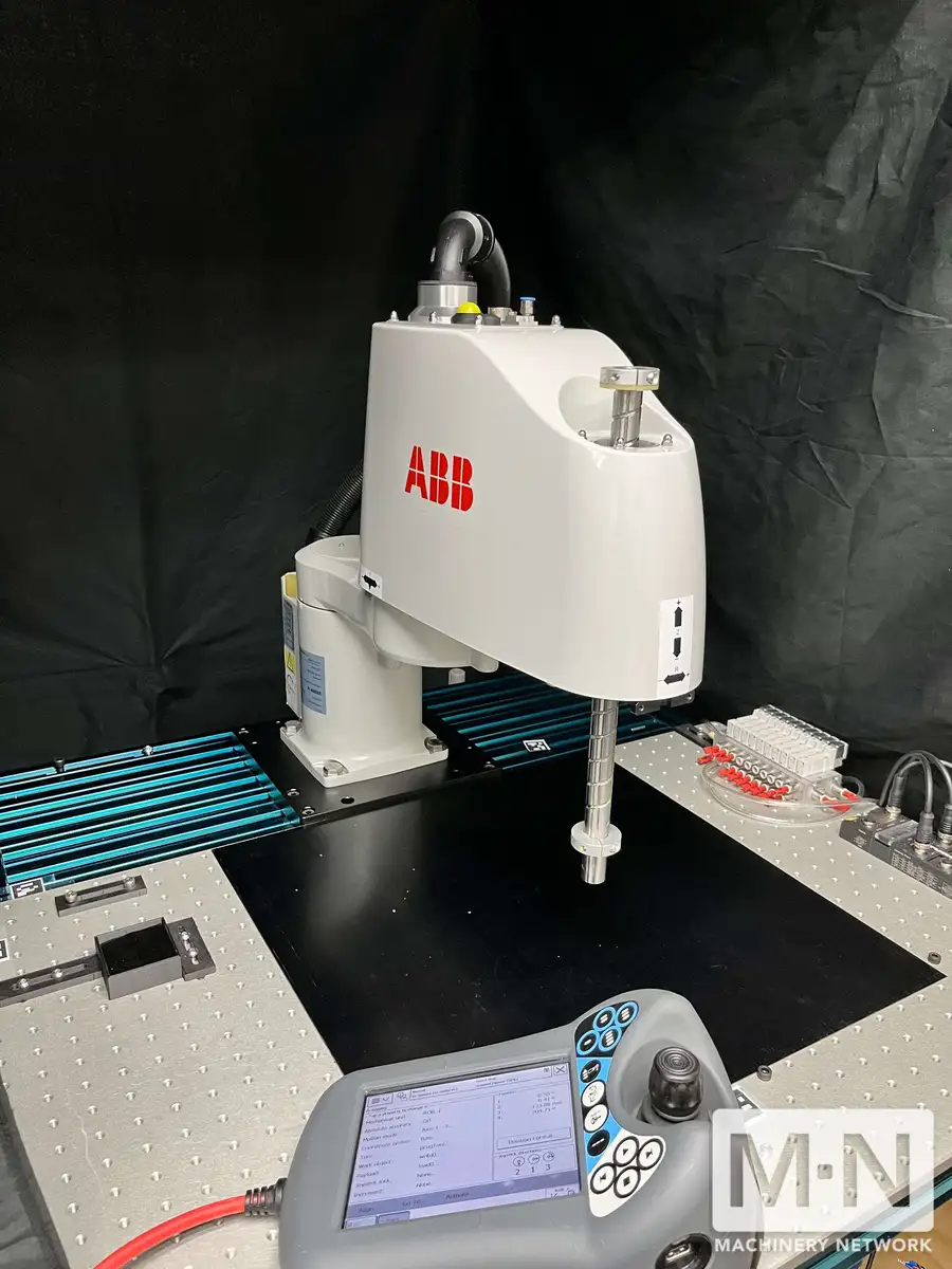 For sale: ABB Flexpicker IRB 910SC-3/0.45, used robot with a 3kg capacity and 0.45m reach. Includes IRC5 Controller, FlexPendant with cable, and various software features. Ideal for precision automation.