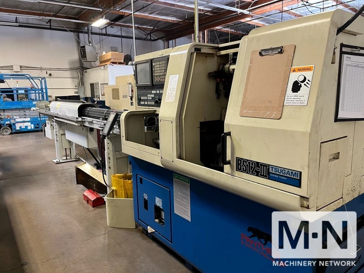 Upgrade your machining with a 2001 Tsugami BS12B III CNC Swiss Machine. Includes a 0.47" spindle, 12k RPM, 8k sub spindle speed, LNS Tryton 112 Barfeeder, 6-axis control, live tooling, and C-axis spindle. Perfect for precise, complex work.